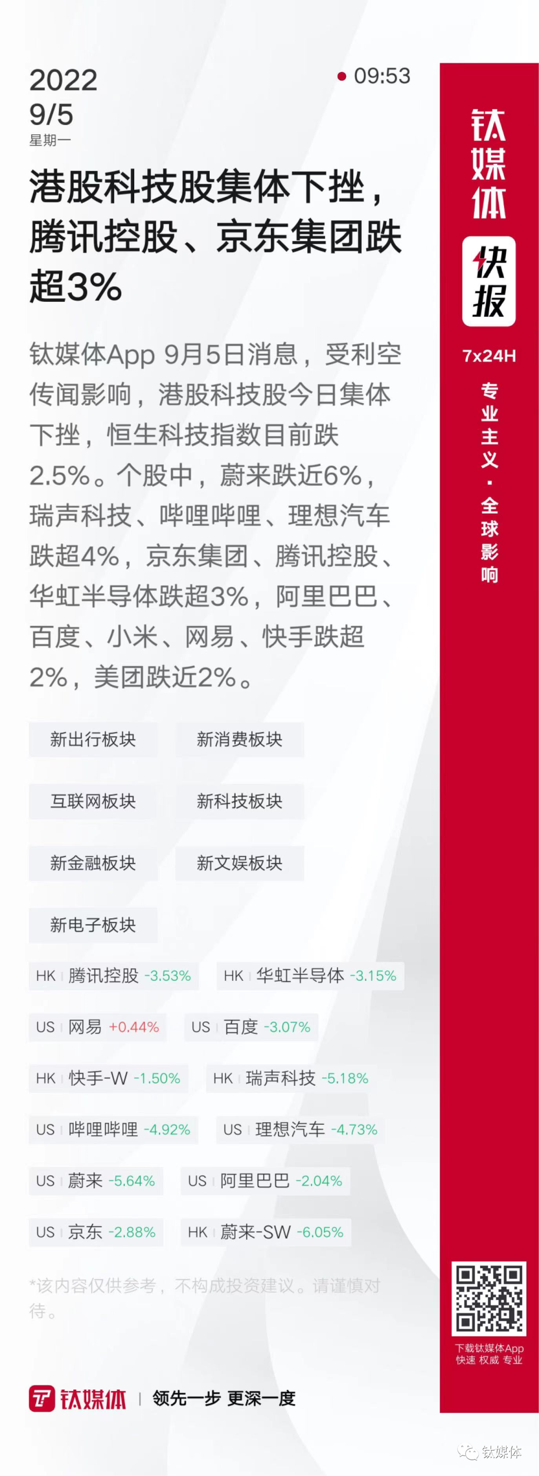 【港股科技股集体下挫,腾讯控股、京东集团跌超3%】