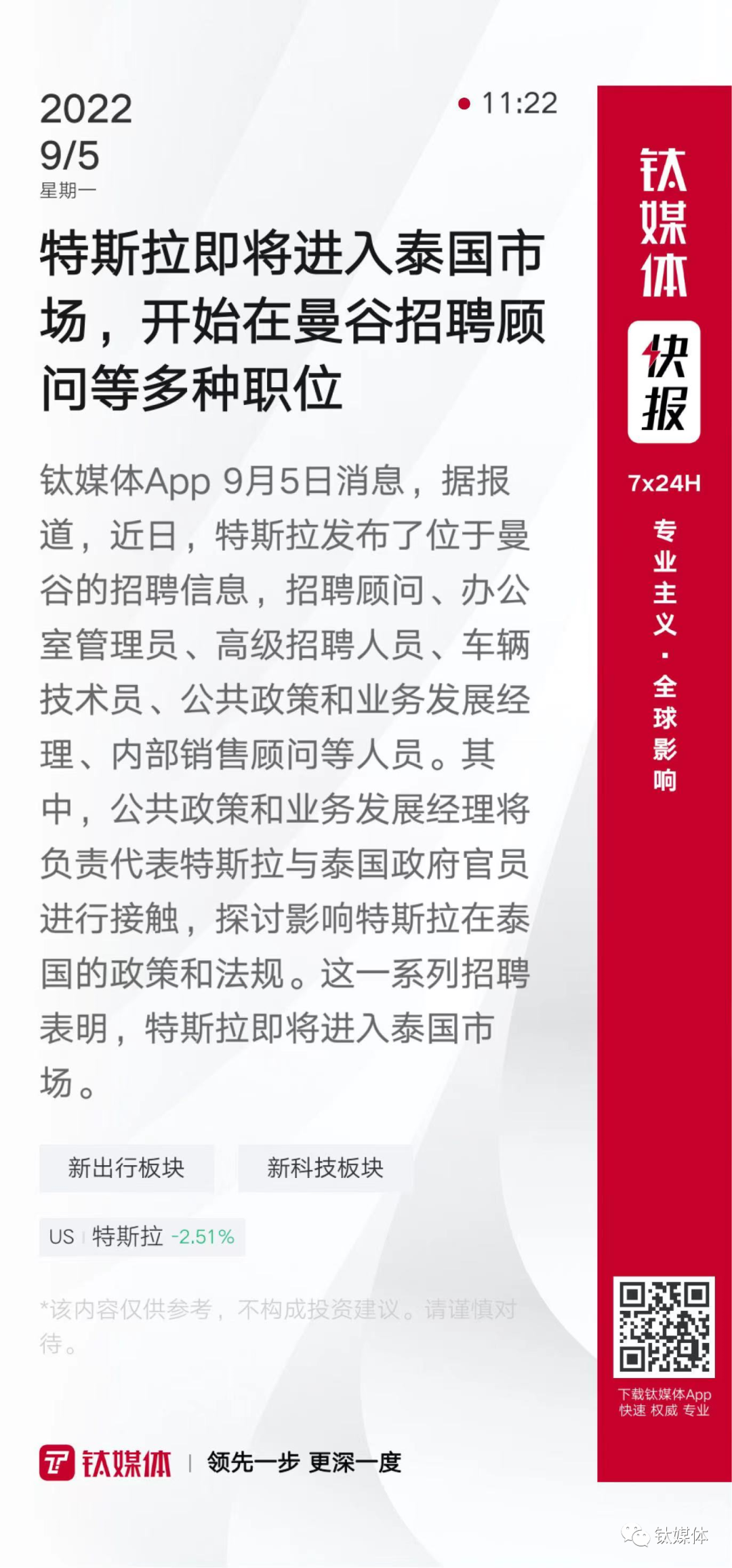 【特斯拉即将进入泰国市场,开始在曼谷招聘顾问等多种职位】