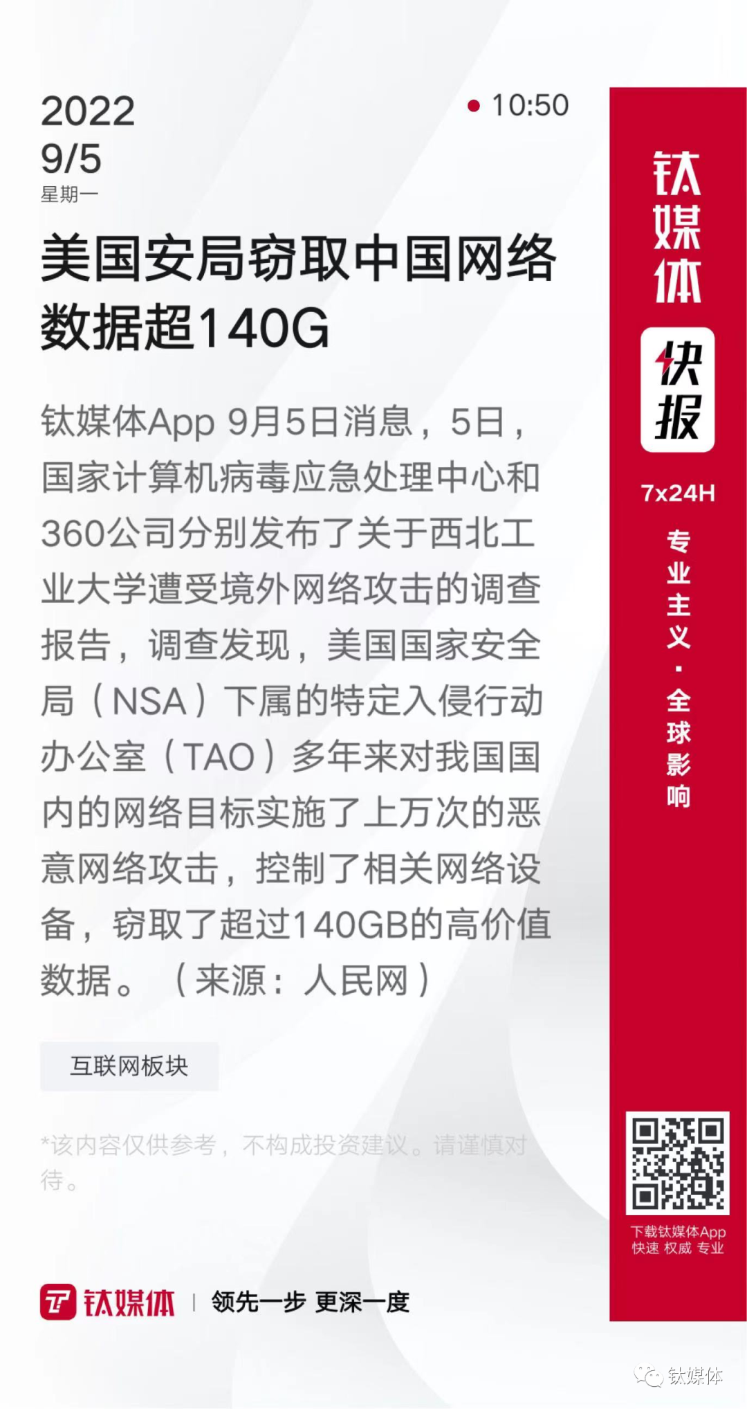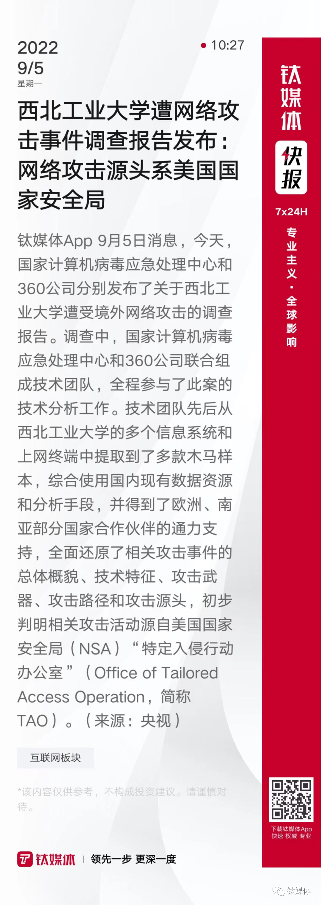 【西北工业大学遭网络攻击事件调查报告发布:网络攻击源头系美国国家安全局】