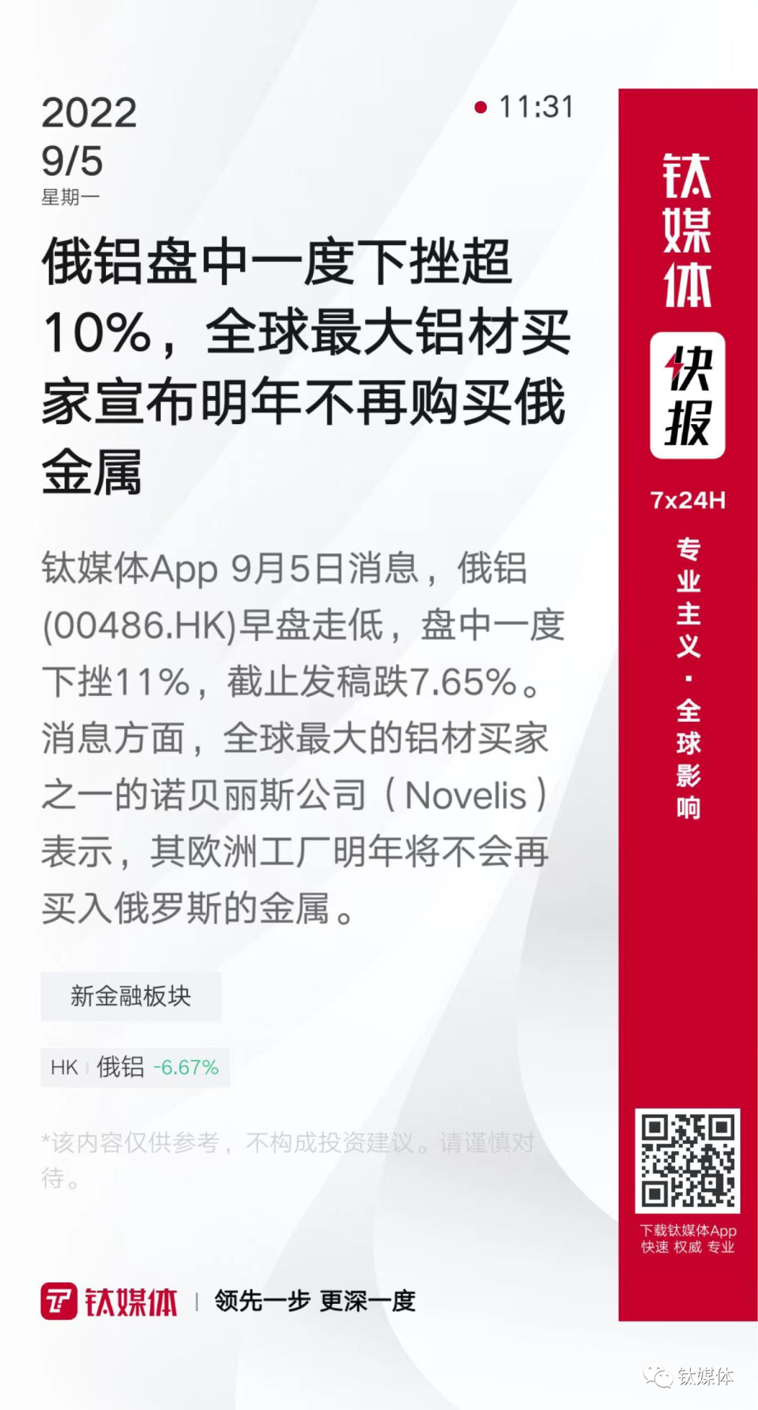 【俄铝盘中一度下挫超10%,全球最大铝材买家宣布明年不再购买俄金属】