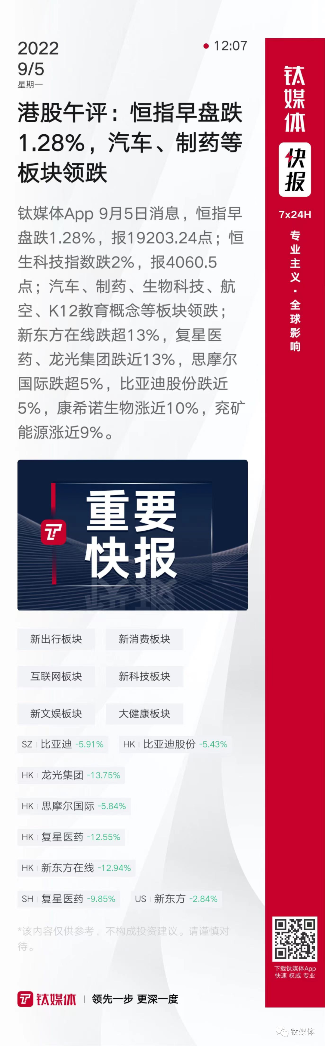 【港股午评:恒指早盘跌1.28%,汽车、制药等板块领跌】