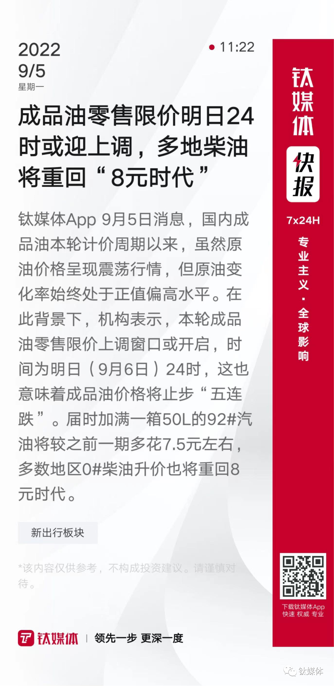 【成品油零售限价明日24时或迎上调,多地柴油将重回“8元时代”】