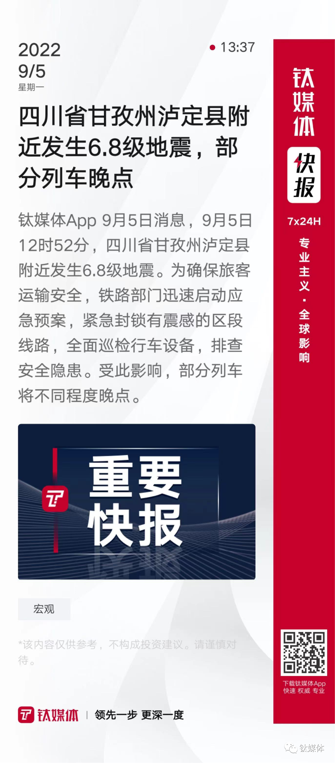 【四川省甘孜州泸定县附近发生6.8级地震,部分列车晚点】