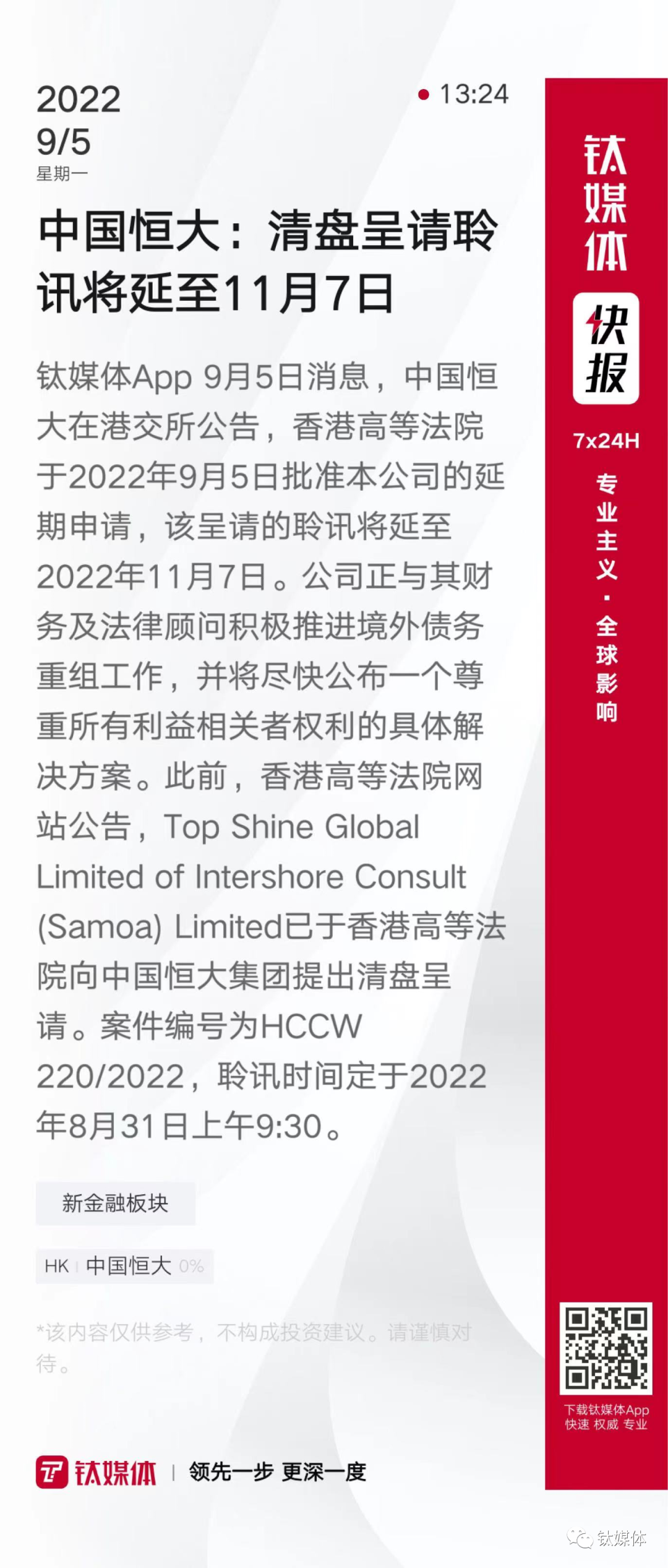 【中国恒大:清盘呈请聆讯将延至11月7日】