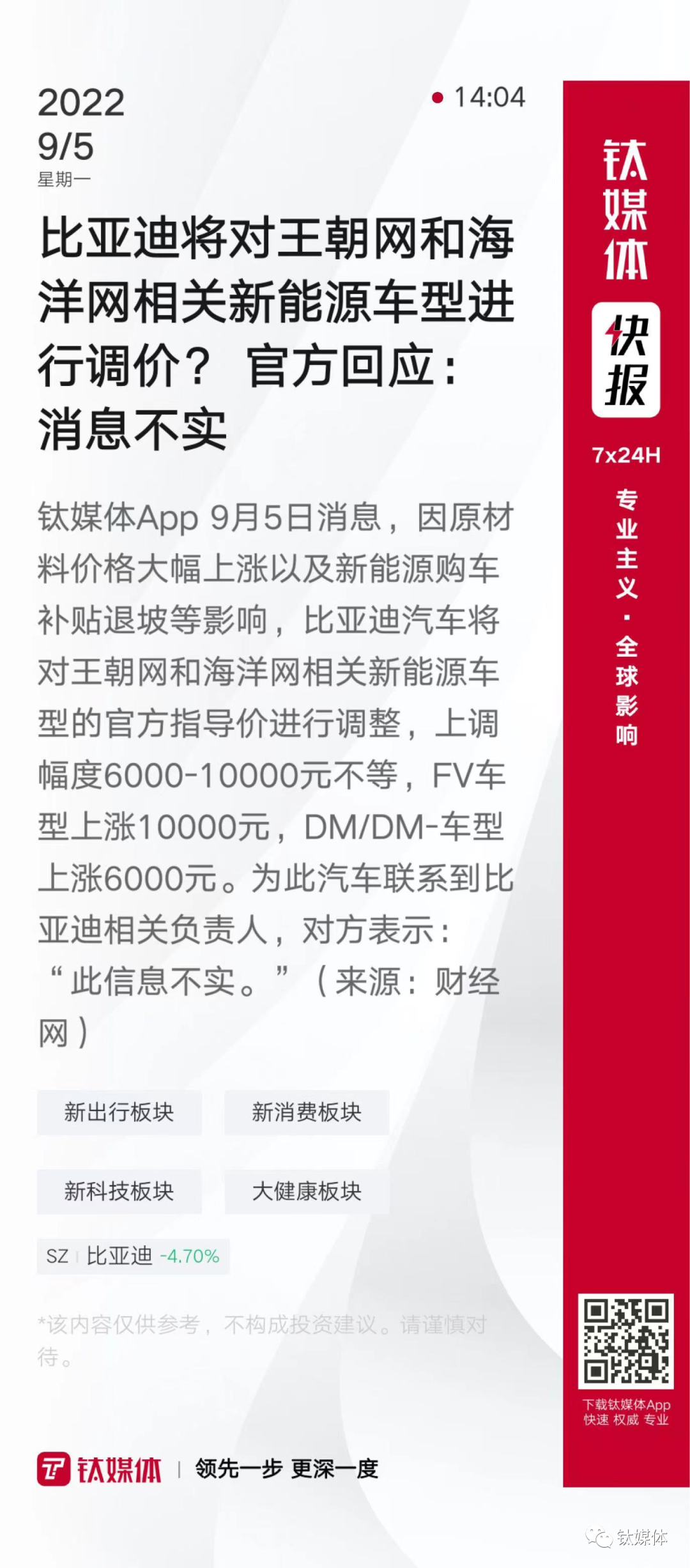 【比亚迪将对王朝网和海洋网相关新能源车型进行调价?官方回应:消息不实】