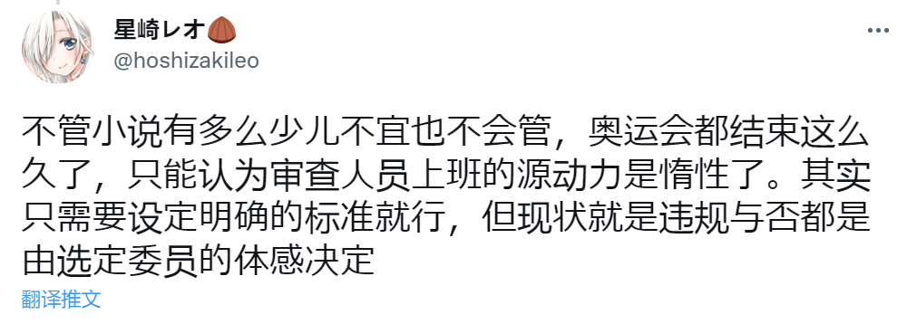无法理解BL漫画行业现状的星崎在推特上公开发声,她认为当前的审核制度不过只是懒政,拿着工资不愿做事的审查人员每个月只需要盯紧BL业界,从中挑出几部色气程度最高、马赛克修正最不明显的漫画开刀,就能敷衍了事,并没有什么所谓的“明确标准”,有的只不过是惰性使然的理所应当。