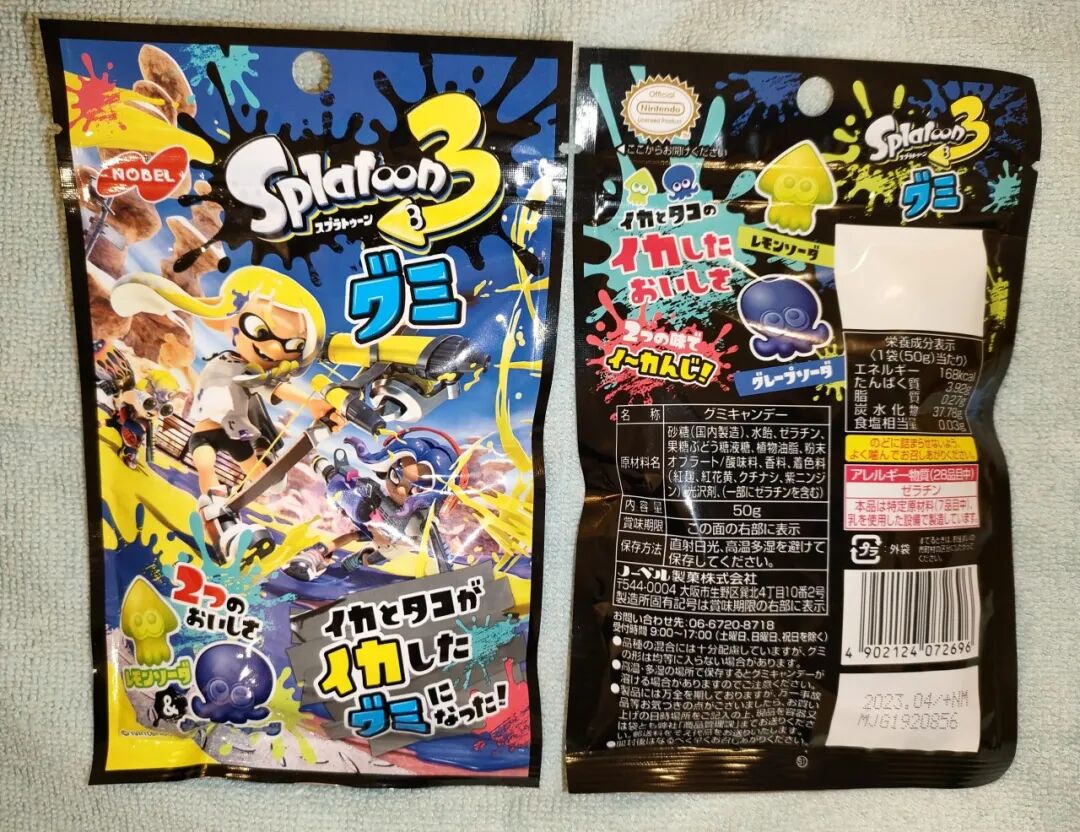 Nobel在日本推出《斯普拉遁3 Splatoon 3》软糖,分为柠檬汽水味和葡萄汽水味,售价140日元(含税)。