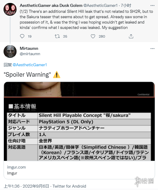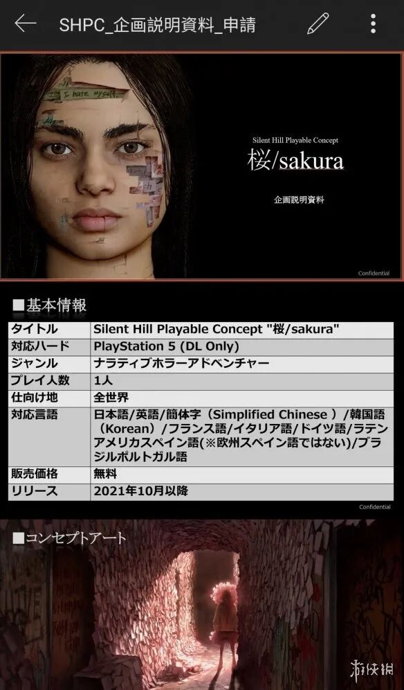 今年5月份时,游戏爆料者 Dusk Golem 泄露了《寂静岭》新作的一些概念图,他表示这款作品正在开发中,并且有索尼的参与。今天 推特用户 Mirtaumn 曝光了这作品的企划说明资料截图,以及一些游戏的基本情报。 据悉,目前曝光的《寂静岭》新作概念图均来自该企划,这是一个代号为“樱花”的寂静岭可玩版概念资料。从基本情报的截图来看,该项目对应平台只有PS5、题材为叙事恐怖冒险游戏、单人游玩、支持简体中文、发售价格未定、预计2021年10月发行。 Dusk Golem此前也提到,这是2020年的东西,一直都处于保密状态,因为泄露,他还被要求删除图片以避免自己的推特账号被封禁。目前尚不清楚这个《寂静岭》新作能何时正式公布。-END-