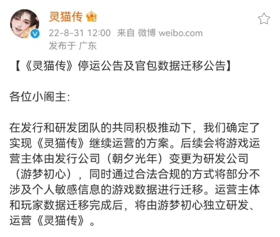 在经过一个月的协商后,《灵猫传》团队发布公告称,《灵猫传》将会继续运营,后续会将游戏运营主体由发行公司(朝夕光年)变更为研发公司(游梦初心),运营主体和玩家数据迁移完成后,将由游梦初心独立研发、运营《灵猫传》。