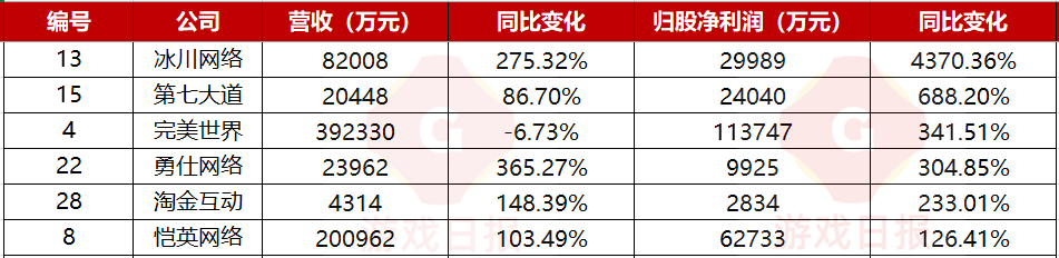 从净利润增长榜单来看,同比增长超100%(排除扭亏为盈的3家公司)的有6家,其中增长幅度最高的是冰川网络,达4370%,另外5家分别是第七大道、完美世界、勇仕网络、淘金互动和恺英网络。值得一提的是,三七互娱增幅仅差2%就可进入此榜单。