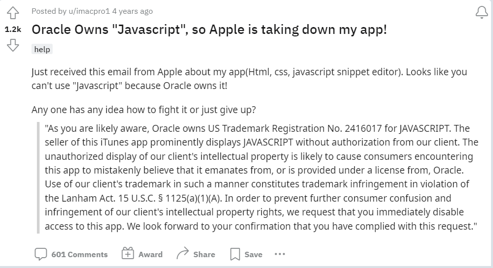 早在 2018 年,关于 JavaScript 商标的问题就曾被热议。当时的讨论起源于一名 iOS 开发者在 Reddit 发帖称,自己开发了一个 App,然后收到了 Apple 的邮件,大概内容是“你不能使用 Javascript,因为 Oracle 拥有它。”