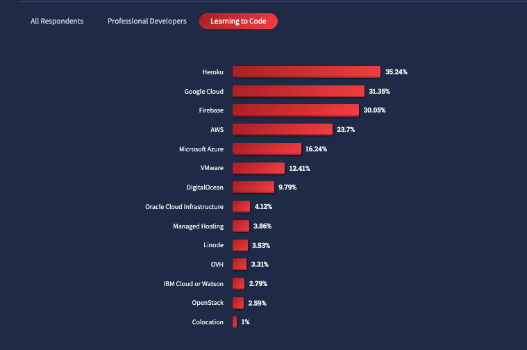 像他这样通过 Heroku 学习编程的,不是少数。在今年 StackOverflow 2022 年度开发者调查报告中,有一个关于“云平台”调查问题,以了解开发者在过去一年中主要在哪些云平台中进行开发工作。在针对“Learning to Code”群体中,Heroku 以 35.24% 的比例位列第一,超过了 Google、AWS 和 Microsoft 。