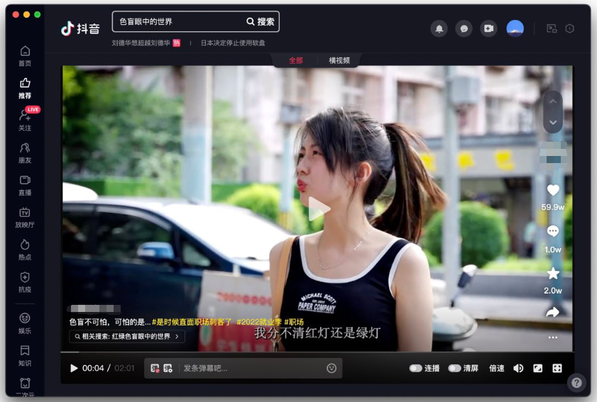 和此前的 Windows 端一样,抖音 Mac 端的整体 UI 布局也与网页版相差不大,都是左侧菜单栏、上方功能栏+中间播放区的组合。同时,用户除了使用鼠标外,也可以使用键盘的方向键进行视频的切换,更适合大屏用户使用。此外,诸如倍速、横屏播放、自动连播等功能,在该版本上也相当齐全。