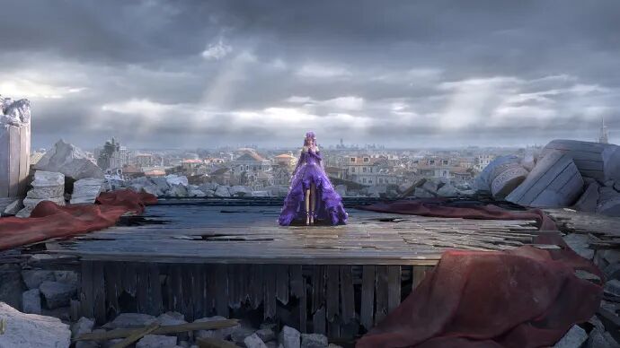 【墟空下的光芒】除了是周年CG外,同时也承担着展现周年概念级套装的任务。那么按照以往我们的常规做法,我们可能会把重点目标放在怎么样去展示这个好看、漂亮的套装上面,核心是【展示】。
