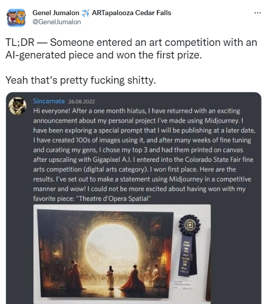 “有人用AI生成的作品参加了比赛,还拿了第一,这太TM糟糕了”