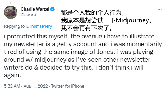 一个月前,美国《大西洋月刊》记者查理·沃兹在给自己的一篇文章配图时,没有像往常一样从图片版权网站Getty Images中选取图片,而是心血来潮的使用了AI Midjourney作画,最终这些内容一起被发表。