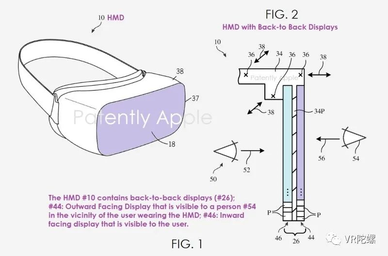 根据苹果公司的说法,内部显示器可以有显示表面(像素阵列),当HMD戴在用户头上时,这些显示表面朝向用户的眼睛。在这种情况下,内部显示器会被隐藏起来,除用户以外的人无法看到显示内容。