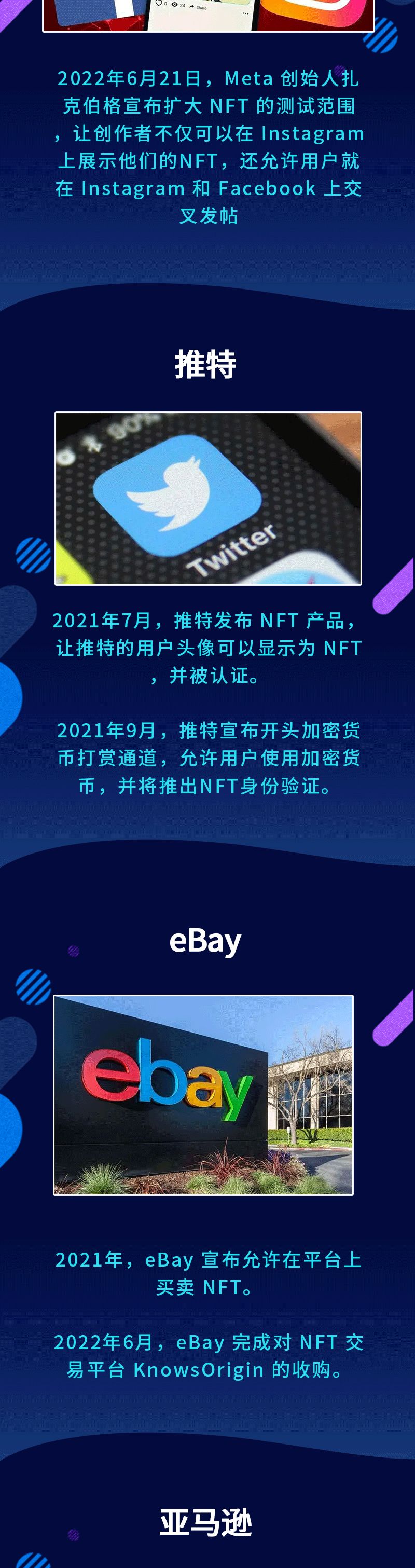 2022年6月21日,Meta 创始人扎克伯格宣布扩大 NFT 的测试范围,让创作者不仅可以在 Instagram 上展示他们的NFT,还允许用户就在 Instagram 和 Facebook 上交叉发帖