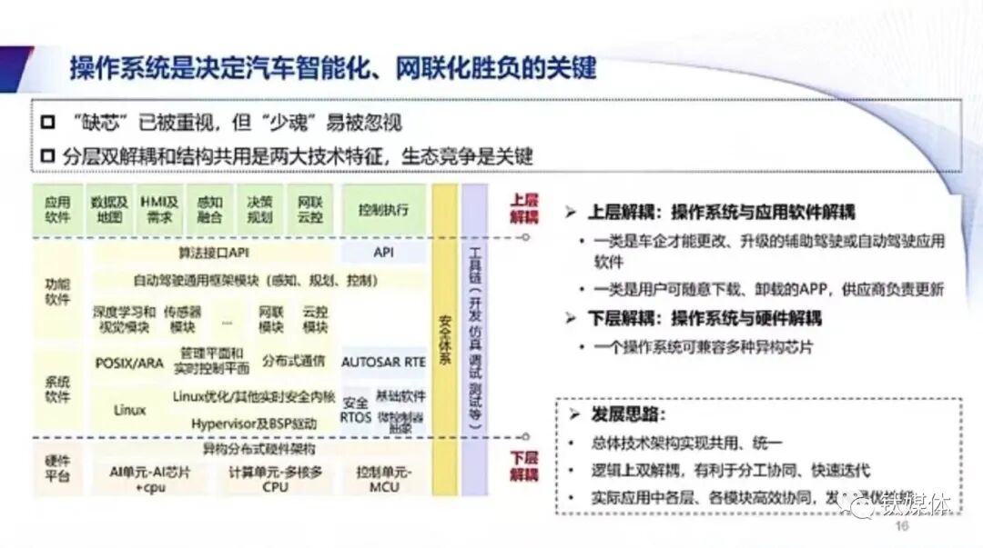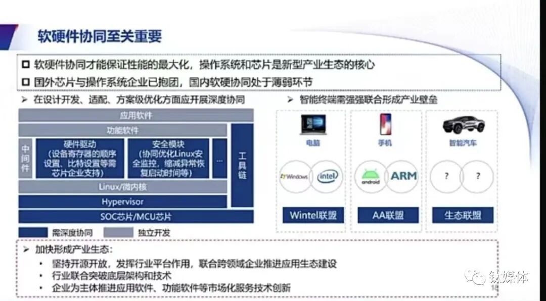整车的电子电气架构由分布式向集中式发展,汽车的软件也从过去的嵌入式软件开发为主向全栈式软件开发演进,操作系统则在其中发挥承上启下的作用,负责对内的管理和对外交互——车机系统发挥对车辆负责管理,对外人机交互,云端系统对数据负责整理传输。从行业发展现状来看,部分车企已经开始自研打造全栈式的操作系统,全栈式操作系统的发展趋势已非常明显。在苗圩看来,有能力的车企自研打造固然是好,但形成生态效应才能赢者通吃。苗圩以手机系统的发展作为参考,在智能手机发展初期,三星有Tizen、诺基亚有塞班,但在安卓开源、开放、免费的趋势下,除了苹果之外,几乎所有的手机厂商都加入了安卓阵营。不仅如此,在智能汽车的发展上,安卓也已经通过车机系统开始进入车企,下一步还将向座舱系统、底盘系统进一步渗透。“我担心三、五年以后会不会形成手机的这种局面,全世界的智能汽车都采用了一个开源的、开放的、全免费的操作系统,一旦这个生态形成,那就是丛林法则、赢者通吃”,苗圩表示。从产业发展来看,特斯拉正在走苹果路线,自己一行一行地写代码,打造了闭环、不开放的操作系统。事实上,国内也有厂商在走这一路线,但这一做法还需要结合产销量数据辩证看待。“如果没有几百万辆的产销量,自动驾驶的功能软件也好、用户所使用的APP软件也好,都不会跟非主流的操作系统去优先适配,而是寻求用户数最多的操作系统,这就是产业发展的生态,没办法。”苗圩指出。不仅如此,苗圩在会上强调,操作系统是比芯片更加迫切的供应链问题。由于近年来芯片短缺,让车企意识到缺芯对于产业发展的制约,但多数车企还没有意识到操作系统的缺失将是致命的问题。从积极意义上来说,通过操作系统打造可以实现硬件和软件的解耦,一个操作系统可以适配若干个异构的芯片,可以适应同样类型的不同厂家的芯片。这类似于计算机即插即用的外围设备,因此在一定程度上,解决好操作系统的问题可以解决我们芯片先进制程发展受阻的问题。“全球智能汽车发展格局还没有定,留给我们的时间窗口大概是三年、最多是五年时间,我们要增强紧迫感,通过三年的努力打造一个自主可控的、开源开放的、最好是免费的操作系统,形成在中国市场上的产业发展生态。”苗圩说道。在提出要求以及展望未来的同时,苗圩也揭开了产业在发展软硬件过程的又一问题——即电子信息、芯片和软件在发展当中软硬件之间的协同不够,搞硬件的就搞硬件,搞软件的就搞软件。从国际发展趋势来看,计算机时代有“wintel联盟”、手机时代有“安卓和 ARM 联盟”,到了汽车时代,软硬件之间也必须在一开始就要协同,这样才可以实现优势互补、合作双赢。“在开放的前提下也不要谋求100%的自主,这是不科学的、是不经济的,也是不可能的。”苗圩表示,“我们不追求百分之百的国产,但是也要防止在关键的时候一些国家对我们发展最快的行业、发展最好的企业进行打压,所以一定要建立起自主可控的操作系统,一定要建立起软硬结合的发展模式,车企一定要在这里面起到牵头的作用。”