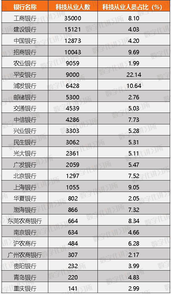 三、金融科技人才建设:工行人数超三万,平安银行占比超20%