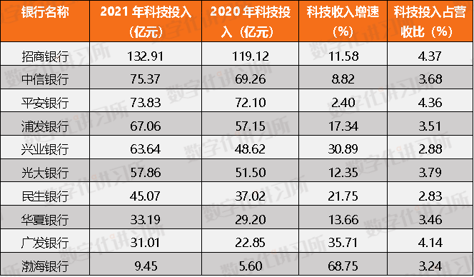 (二)股份制银行金融科技投入概览:招商银行投入超过百亿,渤海银行增速达68.75%
