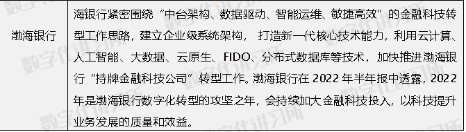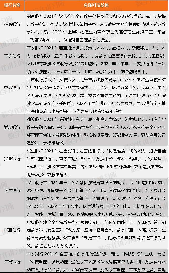 股份制银行整体在金融科技战略上有着明确的目标,例如平安银行2021年着重打造通过打造技术能力、数据能力、敏捷能力、人才 能力、创新能力“五项领先科技能力”;兴业银行2021年在金融科技方面的目标为“构建连接一切的能力,打造最佳生态赋能银行”;民生银行在2021年报中对金融科技发展有详细的规划,以“打造敏捷高效、体验极致、价值成长的数字化银行”为目标;华夏银行坚持“智慧金融、数字华夏”战略;广发银行2021年全面推进数字化转型升级,强化“科技引领”主线,贯彻 “科技赋能”发展动能;渤海银行的金融科技转型工作思路为“中台架构、数据驱动、智能运维、敏捷高效”。通过股份制银行年报中对于金融科技战略的规划中了解到,数字化是大部分股份制银行在金融科技方面的目标,有的股份制银行也提到了平台建设、区块链和人工智能等技术的应用。例如,2021年,招商银行围绕打造大财富管理价值循环的工作主线,深入推进全行数字化转型发展和3.0经营模式升级;依托“人+数字化”持续升级客户服务能力,探索未来银行智能化服务新模式;持续提升数字化运营能力,内部运营及管理效率全面提升;深化科技架构转型,建立适应大财富管理价值循环链的数字科技体系。招商银行2022年最新半年报中还提到了招商银行围绕财富管理业务场景和客户服务需求,构建业内首个零售财富管理业务投研工作平台“财富Alpha+”,助推财富管理数字化提速。平安银行背靠平安集团,2021年着重打造通过打造技术能力、数据能力、敏捷能力、人才能力、创新能力“五项领先科技能力”,为数字化经营提供支撑。加快人工智能、区块链等新技术与银行场景的应用融合。2022年上半年,平安银行将“五项领先科技能力”全面应用于以“用户+场景”为中心的金融服务中,促进前、中、后台决策精准、资源优配、运营高效和价值提升,推动实现决策“三先”、经营“三提”、管理“三降”的目标。中信银行2021年年报显示,中信银行持续加大科技投入,提升产品和服务竞争力,驱动业务和运营模式转型,打造数据驱动型业务发展模式;并且投产国内中大型银行首个自主分布式核心系统,金融科技综合赋能能力提升,人工智能、区块链等新技术创新应用由点及面深度渗透到业务各领域,成为发展的重要生产力。同时中信银行不断加强数字基础设施底座的构筑;2021年,基于完全自主研发的人工智能“中信大脑”平台核心功能基本建成;并且持续深化数字科技向业务领域的赋能。2022年中信银行半年报中提到该行金融科技取得的最新成果,包括:全面推进基础设施云化转型,基础设施云化率达到 99.7%;与华为成立联合创新实验室,着力打造全国领先的金融数字化创新孵化中心等。浦发银行2021年金融科技主要重点在整合各类场景、流程和服务,打造产业数字金融 SaaS 平台,加快探索平台 化生态经营新模式。深入构建企业级内部管理平台和大数据能力体系,激活数据要素,赋能业务发展,驱动全景银行建设进一步提级增效。兴业银行2021年在金融科技方面的目标为“构建连接一切的能力,打造最佳生态赋能银行”,有序推进业务中台、数据中台、技术中台建设,加快构建平台型组织,技术基座更坚实;各业务条线围绕生态圈构建生态金融服务方案,提升场景生态服务能力。民生银行在2021年报中对金融科技发展有详细的规划,民生银行立足“敏捷开放的银行”新时期战略定位,制定《中国民生银行数字化金融转型实施策略》,明确全行数字化金融转型方向。以“打造敏捷高效、体验极致、价值成长的数字化银行”为目标,通过优化体制机制,全面提升数据能力与科技能力,开展生态银行、智慧银行“两大银行”建设,推进全行数字化转型。2022年半年报中,民生银行提出了新的目标,包括加强云计算、人工智能、隐私计算、5G、区块链等技术应用,开展实时数据规模化应用专项行动和在总行云、分行云、生态云“三朵云”的基础上,构建云原生应用和服务平台。华夏银行2021年年报中指出本年度科技综合实力大幅增强。华夏银行建立企业级数字科技管理机制,一体化协同能力进一步加强。开发投产需求数量同比接近翻番,科技生产力有效提升;并且制定数字科技转型五年行动方案,坚持“智慧金融、数字华夏”战略;探索产业数字金融创新路径,形成京津冀、长三角、大湾区、中西部重点区域先行突破、全行多点开花的推进态势;全面启动“禹治工程”,以数据应用驱动数据治理提质增效,数据基础能力有效提升。广发银行(注:为非上市银行)2021年全面推进数字化转型升级,强化“科技引领”主线,贯彻 “科技赋能”发展动能,坚持以客户为中心,通过数字化技术深入洞察客户需求,提供优质服务,实现极致的客户体验;聚焦营销领域重点,结合行业不断涌现的业务场景构建数据应用,提升获客水平。加强产品研发创新,持续推进综合化金融产品协同布局,根据客户真实需要提供定制化产品,提升自身产品差异性竞争力。利用数据智能驱动广发银行的经营决策,沉淀数字资产,提供数字赋能,支撑数字运营,实现数字化经营。渤海银行在2021年年报中透露,渤海银行紧密围绕“中台架构、数据驱动、智能运维、敏捷高效”的金融科技转型工作思路,建立企业级系统架构, 打造新一代核心技术能力,利用云计算、人