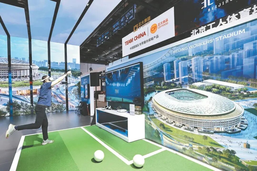 参观者可以佩戴VR头显设备,成为现实世界中的足球守门员,与元宇宙世界的足球前锋进行点球较量——该头显设备目前已经可以实现双目4K级画质和时延低至20毫秒的元宇宙体验。
