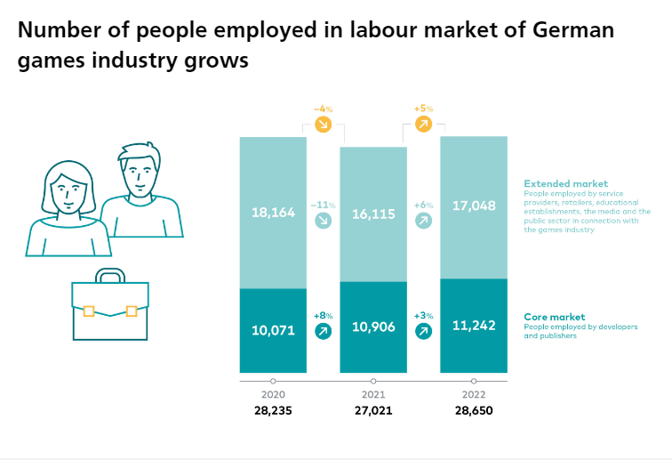 另一方面就是欧美人口较少,且分布较散。以欧洲最大,世界第五大游戏市场德国为例,根据《德国游戏产业年度报告2022》,德国国内共有786家公司在参与电子游戏的开发和营销,但游戏行业内的雇员人数在增长了近3个百分点后,也只有11242人,加上外围媒体、零售商等,游戏行业创造的就业岗位也不到3万个。