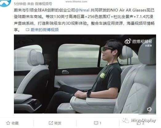 9月6日消息,据蔚来官微消息,蔚来与AR创业公司Nreal共同研发的NIO Air AR Glasses现已登陆蔚来车商城,可带来等效130英寸高清巨幕+256色氛围灯+杜比全景声+7.1.4沉浸声音响系统的影院级车内3D观影体验。NIO Air AR Glasses今天上午10时30分在蔚来App车商城上线接受预定,首副优惠套装预售价格2299元。
