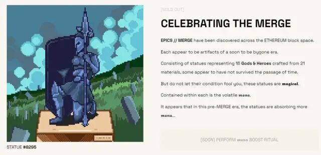 EPICS MERGE 是 Proof of Beauty NFT 工作室为庆祝以太坊合并而创建的链上像素艺术项目。EPICS MERGE 在以太坊区块空间中被发现,每一个雕像都是一个即将过去的时代文物。这些雕像由 21 种元素构成,共有 16 位神话人物和英雄。有些雕像似乎无法在时间的流逝当中幸存下来,但不要被他们的状况所欺骗,每一个雕像在合并完成之前吸收更多的法力点,合并之后,他们可以通过提升仪式得到重生。