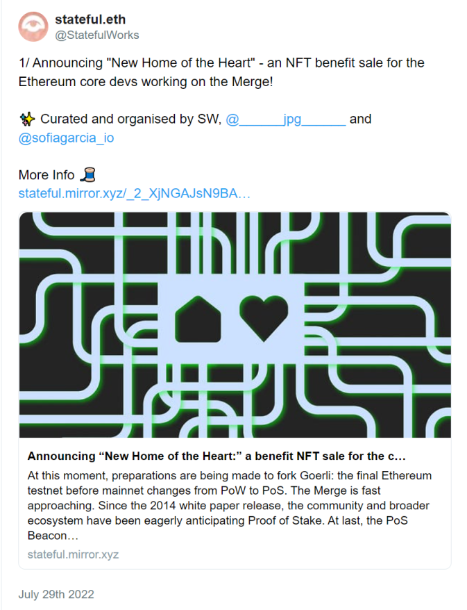 New Home of the Heart 是一个庆祝以太坊合并的 NFT 展览和销售,由 Stateful Works、JPG(注:JPG 是 Web3 文化基础设施提供者,用户可以用其策划 NFT 展览。)和 Sofía García 共同策划。该项目的任何收益都将分配给以太坊核心开发者和参与的艺术家。为展览贡献作品的艺术家包括 Sarah Zucker、Shl0ms、Snowfro 等。