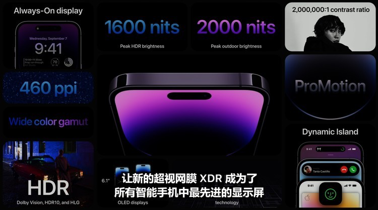 iPhone 14 Pro/Pro Max 对屏幕进行了升级,边框更窄,面积更大,支持2000nit峰值亮度,支持全天候全屏息屏显示。配置上,搭载了A16芯片,4800万像素主摄,支持二代位移防抖,传感器尺寸更大,支持像素4合1,可以拍摄ProRAW格式照片。