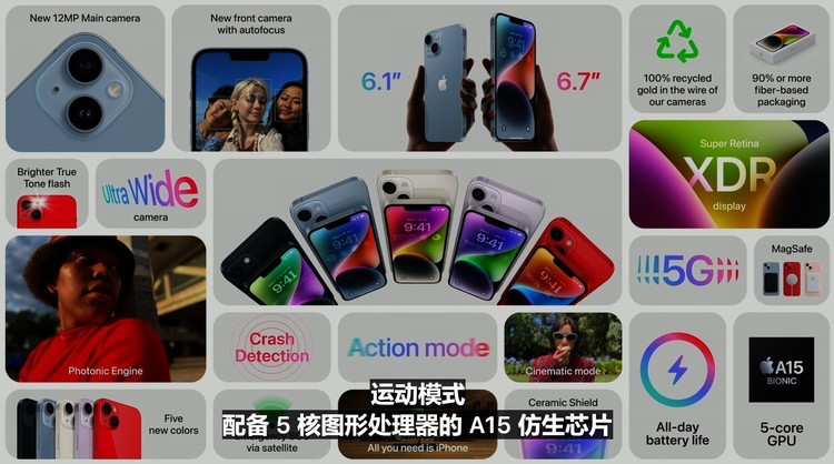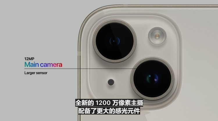 iPhone 14 屏幕依旧为6.1英寸,搭载A15芯片,支持MagSafe充电;保持刘海屏、直角金属中框,配备双摄像头;支持杜比视界,支持 True Tone 显示,峰值亮度能达到1200尼特。与前代产品的区别在性能更强,相机1200万主摄具有更大感光元件,前置摄像头加入了自动对焦功能,为了提升拍照,苹果还引入了相机引擎(photonic engine)。