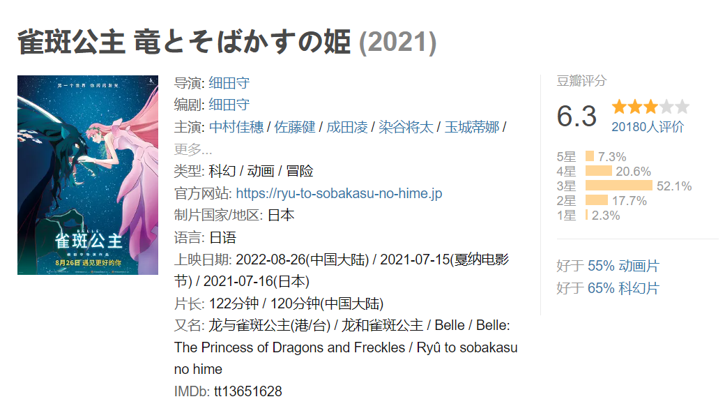 事实上2021年在日本上映的时候,《雀斑公主》获得的整体反响相当不错,位列当年日本动画电影票房第三位,仅次于《新世纪福音战士 终》和《名侦探柯南 绯色的子弹》,之后的全球票房也挤进了日本动画电影的历史前三十,大小奖项拿了不少。