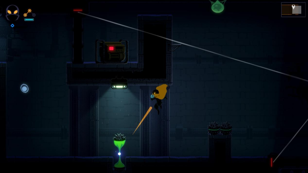 本作在很多地方的设计上是很蹊跷的:明明是一个有着复杂地图的“类银河恶魔城”游戏,但是主角却不能二段跳;很多平台所处的位置,却正好位于主角大跳后差一点的高度;很多埋在墙里的机关,原本应该是用黑客装置触发,但玩家却可以通过延长普通攻击后触发;获得关键能力的地点,有些有着两个以上的入口。