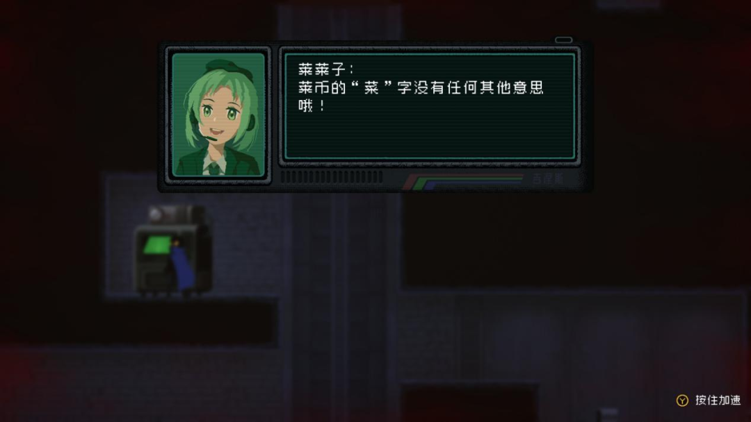 有趣的是,这个系统是以符合游戏世界观的方式来呈现的:在玩家死到一定次数时,还会有“菜币”公司的客服“菜菜子”给你打电话推销产品,如果你对他们的产品不满意,“菜菜子”还会给你“螺旋下跪”道歉。此外,这个角色还有着自己的剧情线,如果想要完成全收集,“菜菜子”的剧情线也是需要推到底的。