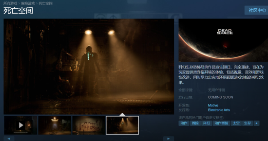 《死亡空间:重制版》Steam页面现已正式上线,本作将于2023年1月27日发售,登陆PlayStation 5、Xbox Series X|S和PC平台。