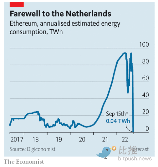 这不仅仅是技术上的微调。这是对一款已经运行了7年、价值2000亿美元的软件的彻底改造,如果一切按计划进行,它将在不停机的情况下实施。加密领域的人们喜欢将这一过程比作在飞行途中更换飞机的引擎。工作量证明为能源密集型,需要大量的计算能力,这导致像以太坊和比特币这样的区块链消耗的能源与小国家一样多。而权益证明可以减少99.9%的能源消耗。这对排放的影响将在一夜之间产生,预计合并后以太坊在荷兰将被关闭 (见图表)。更重要的是,如果合并成功,将表明以太坊具有自我完善的能力,为更彻底的改变打开大门。