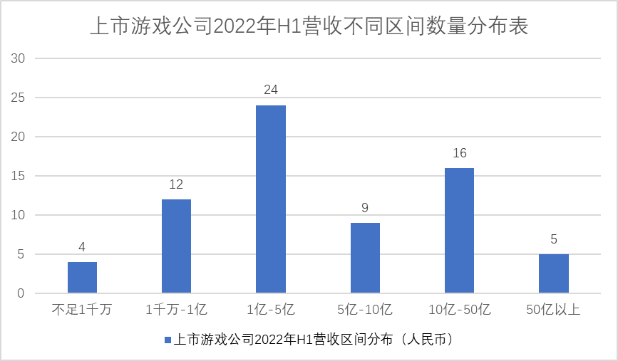 8月,超过70家上市游戏公司陆续发布2022年半年度报告,经过游理游据研究院整理汇总,了解到从营收数据上来看,有5家游戏公司2022年H1营收超过5亿元,有4家上市游戏公司营收不足1000万元,整体来看营收多数集中在1亿-5亿、10-50亿区间。