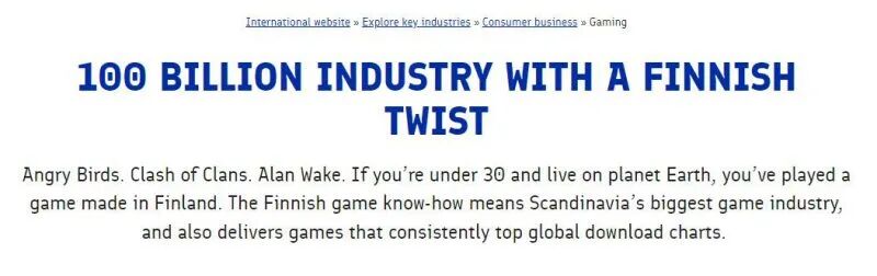 作为人口仅有550万的小国,芬兰游戏业显赫的名声和其人口数显得有些不成比例:手游巨头Supercell在芬兰开发的《部落冲突》、《荒野乱斗》享誉全球,由Rovio一手捧火的《愤怒的小鸟》至今依然是全球最热的游戏IP之一;开发出了《Control》、《Alan Wake》的绿美迪工作室和去年刚被索尼收编为旗下第一方的Housemarque工作室,都是3A游戏开发界两大不可忽视的中坚力量。无怪乎芬兰经济部在其官网上自豪地宣布:“只要你三十岁以下且生在地球上,你就一定玩过芬兰游戏!”