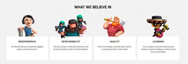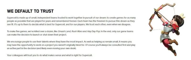 之所以领导会在指挥开发上退居侧位,是因为芬兰公司普遍笃信员工的个人价值。Supercell在其招聘官网上写到,在他们的管理模式中,“每一名员工都有自己的强项和优势,因此人人都是平等的”。其官网的员工反馈中有人提到,每一名初次入职的同事都会收到CEO或高层的热情接待,他们之间的沟通也不用经过中间层级的人进行间接传达,“因为Supercell相信,只有每名员工都受到了重视,才能将游戏开发这类集体劳动完成得尽善尽美。”
