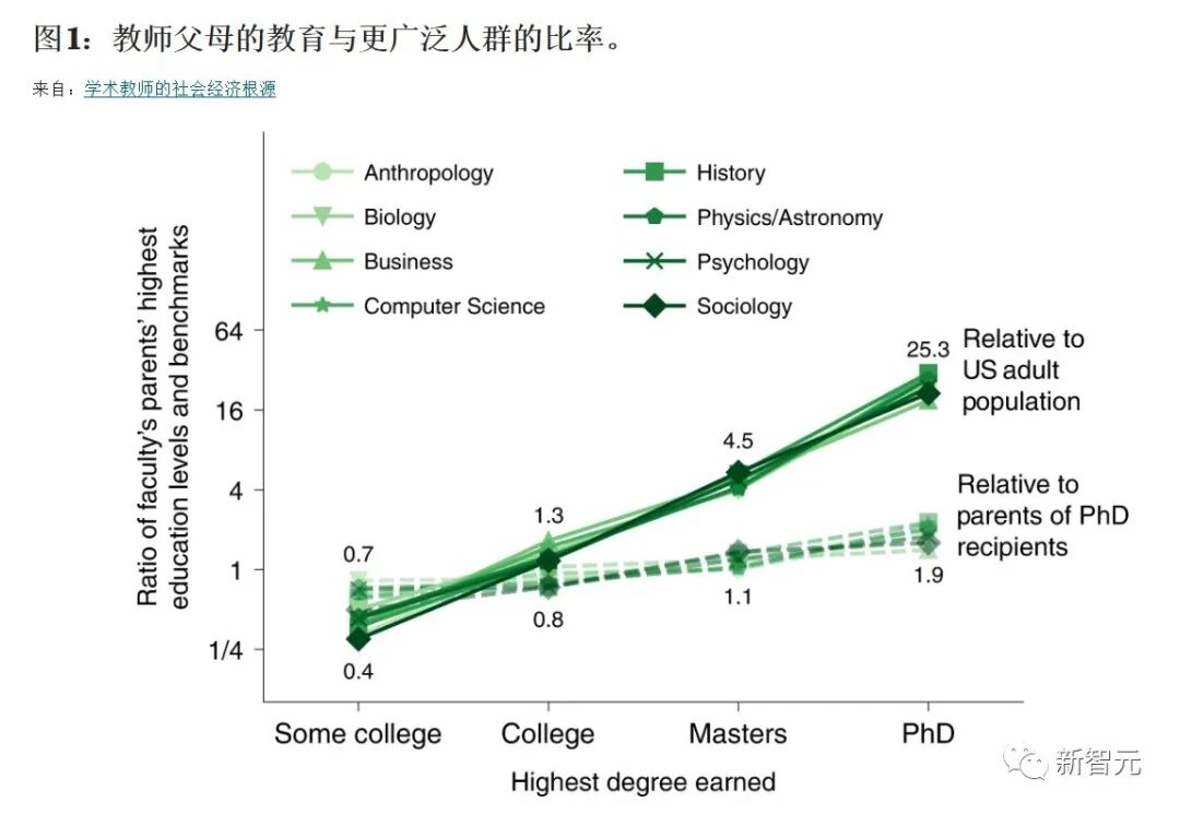 研究者发现,在8个领域的一流大学中,近1/3的教授说他们的父母中的一位拥有博士学位。而在这些精英系的教师中,父母拥有博士学位的可能性比在最不知名系的教师高出57.4%。