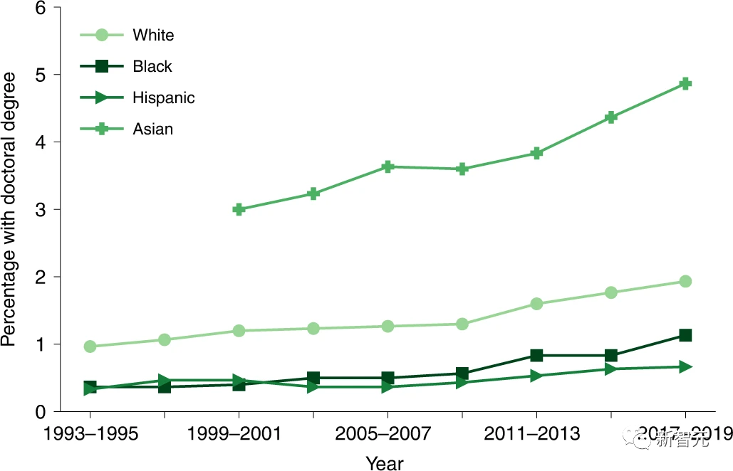 在白人教授中,23.4%的父母拥有博士学位。而黑人和西班牙裔获得博士学位的仅有17.2%和16.9%。