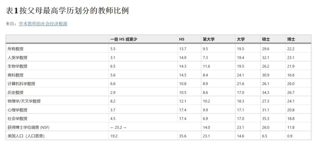 在美国学术界中,近四分之一终身教授的父母拥有博士学位,这一比例大约是普通人群的25倍。而在名校中,这一比例还要再翻一番。