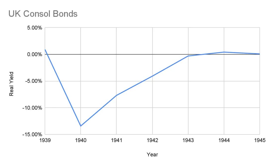 在1939年至1945年的战争期间,Consol债券的持有者实际损失了24%。感谢参与!