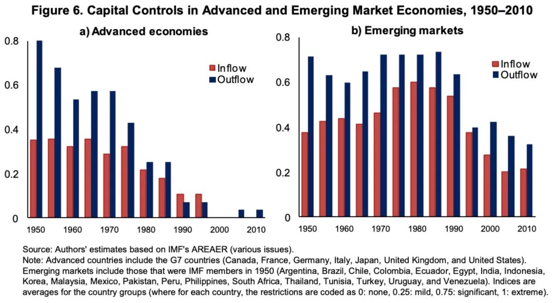 下面的图表显示了战后布雷顿森林协定生效后资本管制的普遍性和持久性。