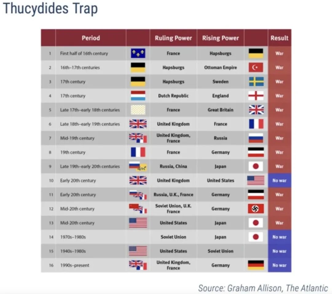 在列出的16起事件中,75%的事件导致了战争。我们希望避免重大的动态冲突,但历史不会站在人类一边。