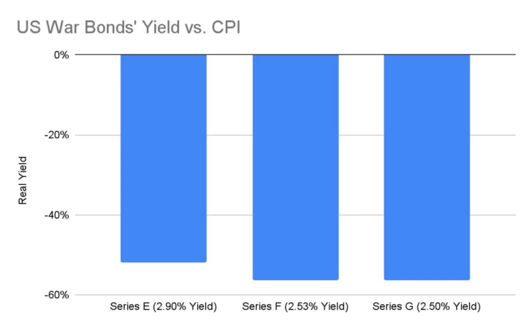 战争债券是一项好的投资吗?那要看你对“好”的定义了。如果你所说的“好”是指债券持有人获得的收益超过了通胀,那么让下面的图表来驳斥那些认为这些是“好”投资的说法吧。