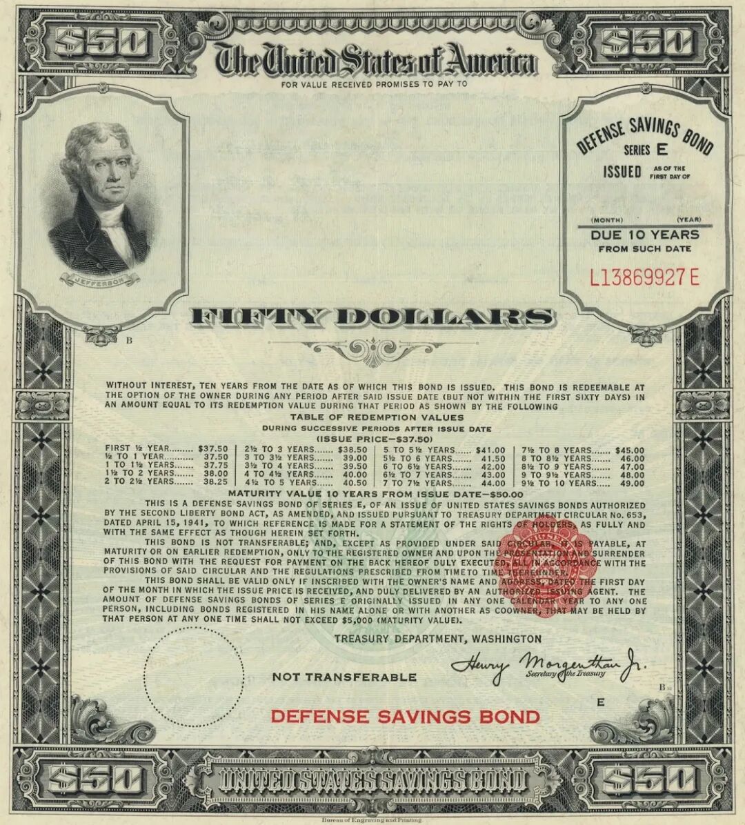 1941年至1945年间,美国发行了1860亿美元的战争债券(E、F、G)。下面是其中一个的图片。