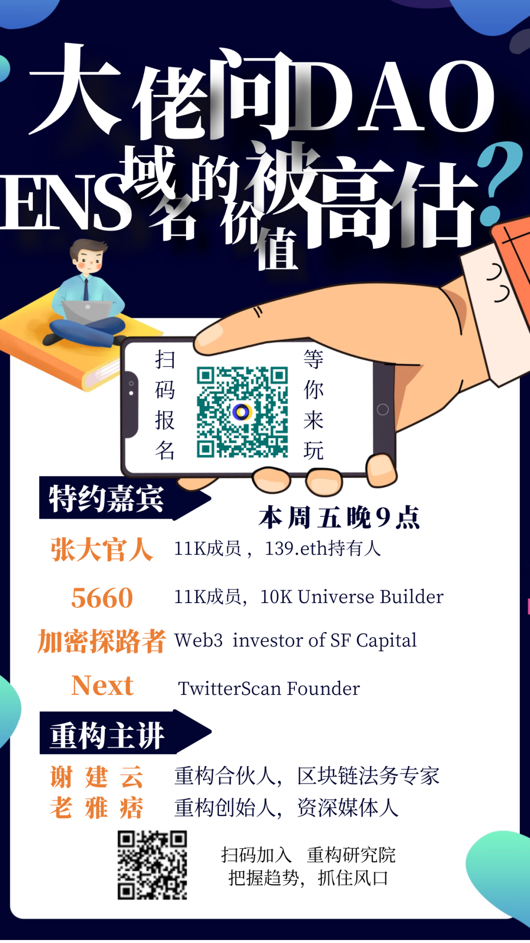 另外,本周五晚9点,我们的《大佬问DAO》已经开放报名(二维码在文章中的海报里),活动是半开放性质,记得先报名再来玩儿哦。我们邀请了ENS大佬们来聊聊ENS的价值。